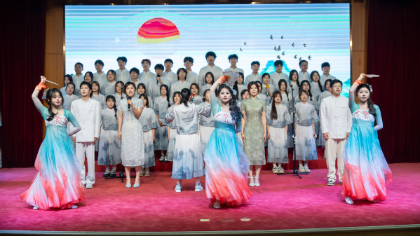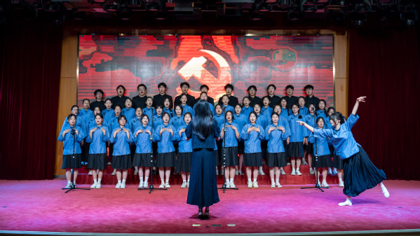 华友新材料学院24化工装备2班通过《我爱你中国》的合唱与朗诵结合,深情表达对祖国的热爱,并以实际行动诠释科技报国的使命担当。