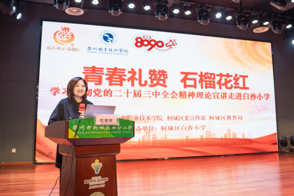 为进一步凝炼我校“青春信仰青年讲”8090+新时代理论宣讲思政工作品牌和东南阙里“石榴红”思政工作联盟校地、校际合作新模式,更好地准确把握大中小学思政教育一体化建设的深刻内涵,协同推进一体化建设的贯通衔接,12月6日,我校联合柯城区委宣传部和柯城区教育局在柯城区白沙小学举行“青春礼赞 石榴花红”学习贯彻党的二十届三中全会精神理论宣讲活动。我校党委委员、宣传部(统战部)部长孔庆红,柯城区教育局党委书记、局长刘秀芬,衢州市语言文字工作委员会专职干部林哲慧,柯城区社科联副主席徐春春以及我校和柯城区白沙小学300多名师生共同参加活动。